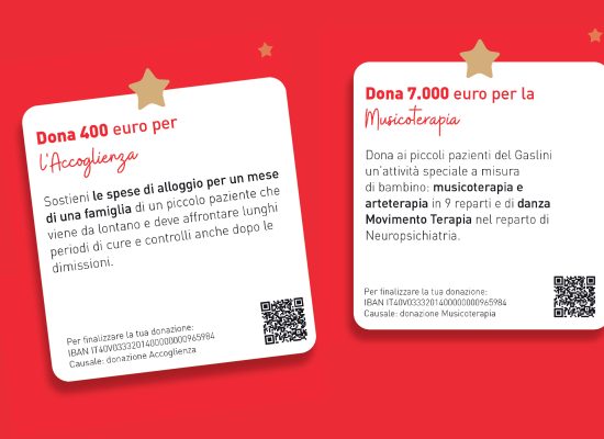 È la possibilità di fare due volte bene: con un regalo a chi ti sta a fianco ogni giorno farai un regalo anche ai piccoli pazienti dell’Istituto Giannina Gaslini