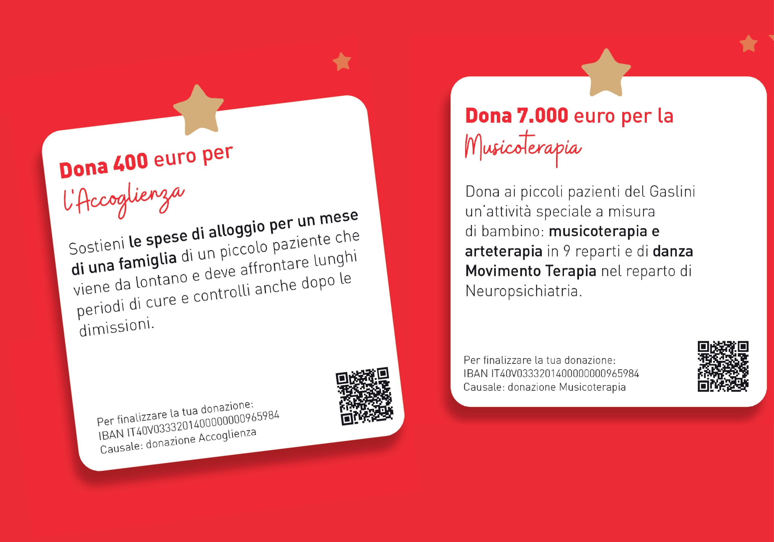 Ci sono diversi tipi di doni. Ci sono i pacchetti regalo, li ricevi e li apri insieme ai tuoi cari. Ci sono poi i nostri pacchetti, sono speciali, perché con uno di essi il tuo dono arriva direttamente ai bambini dell’Istituto Giannina Gaslini.